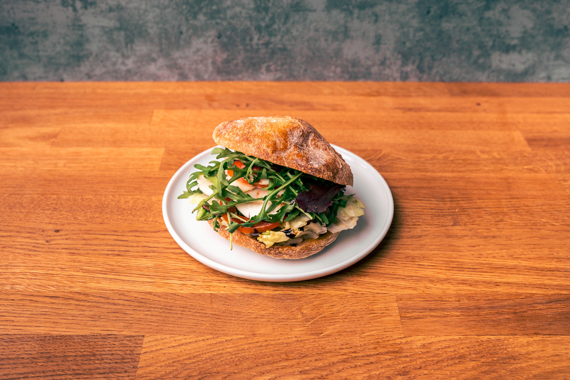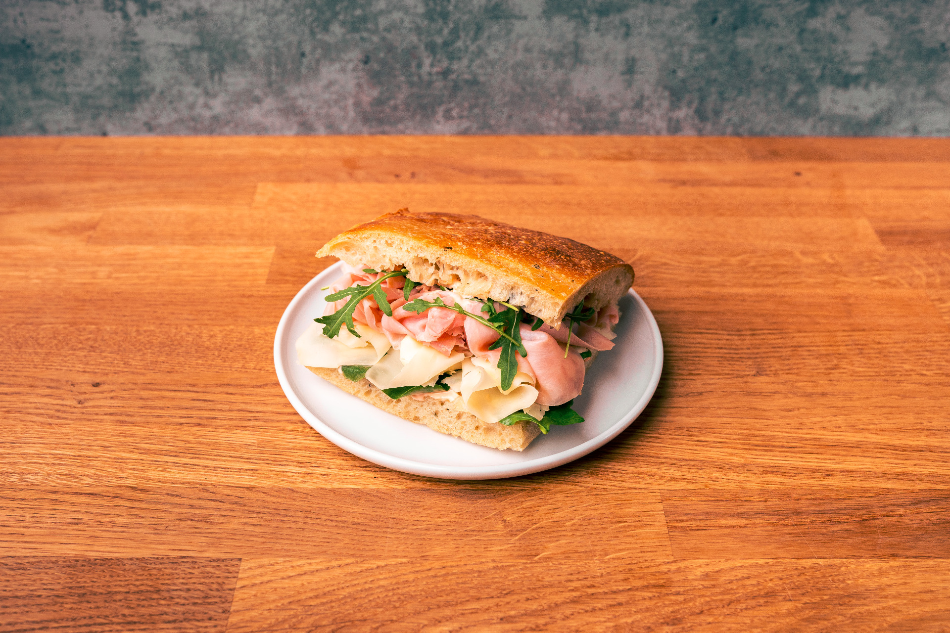 Włoska szynka dojrzewająca, ser dojrzewający, rukola, majonez z wędzonych warzyw
