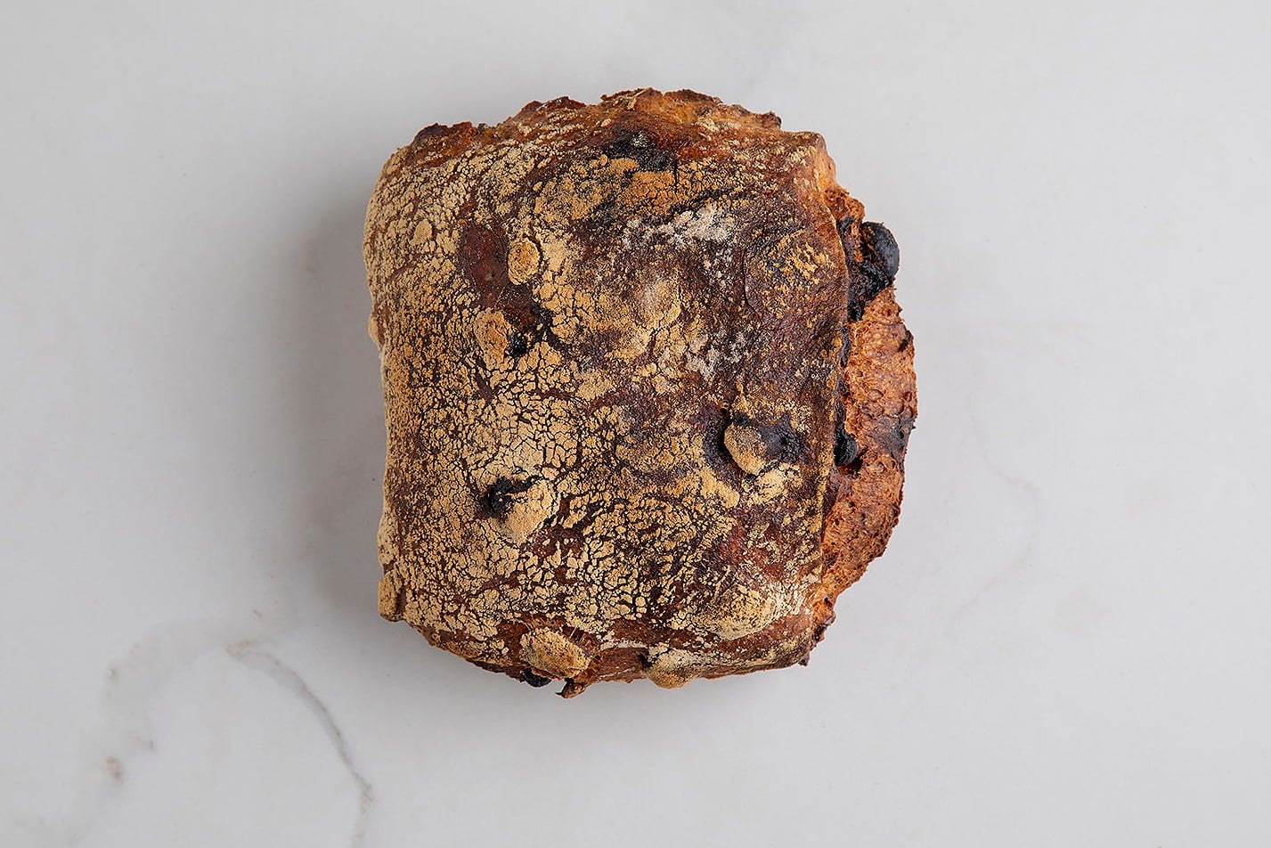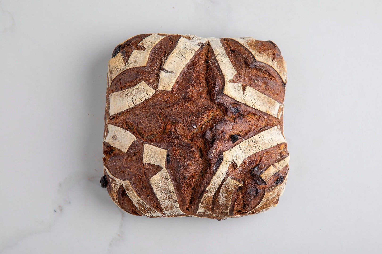 Mąka razowa Bio, mąka graham Bio i mąka kamut Bio, zakwas żytni, orzechy włoskie, laskowe, migdały i rodzynki sułtańskie, gruba sól z Bretanii lub z regionu Camargue.