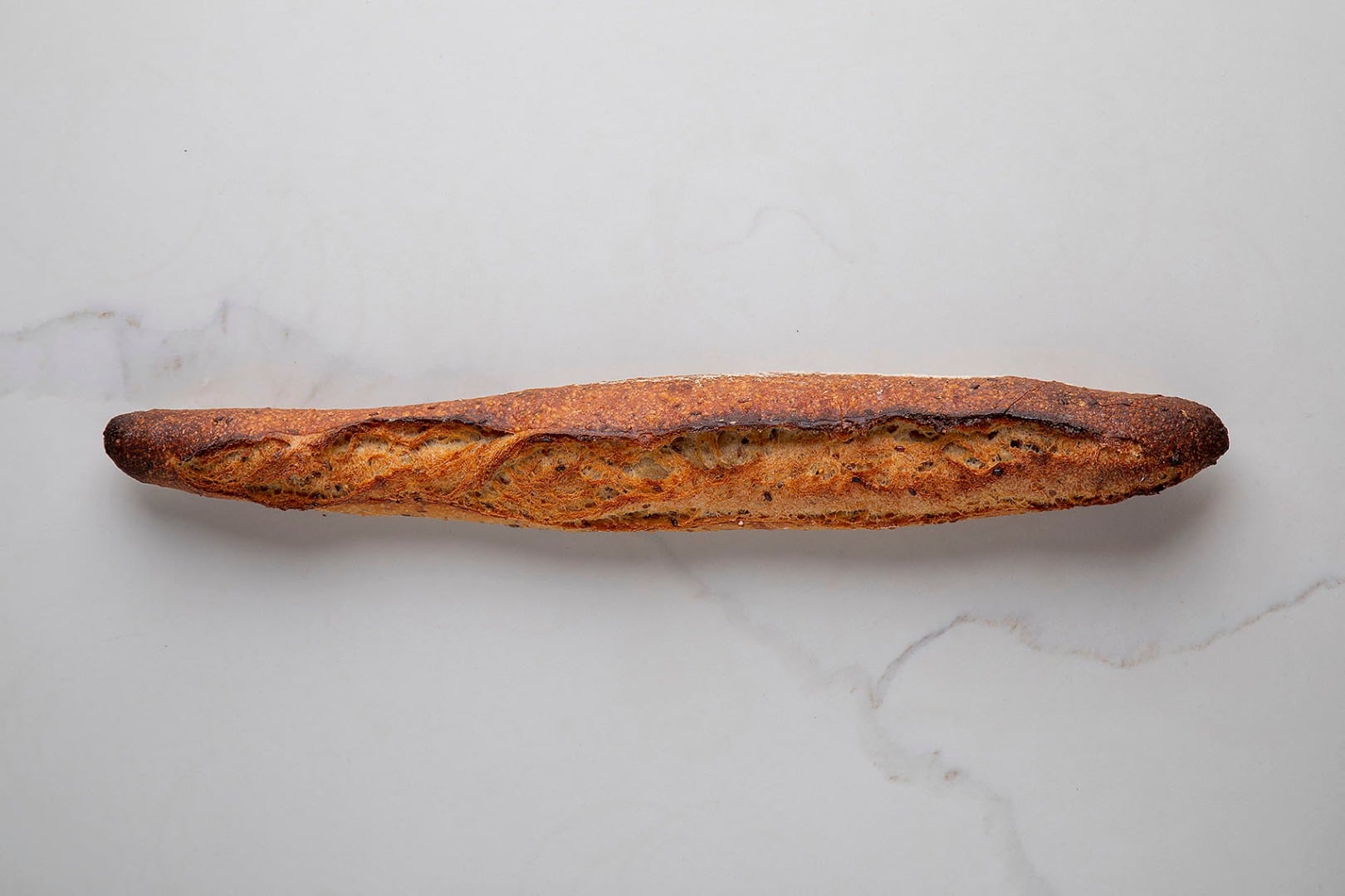 Mąka pszenna LABEL ROUGE, płynny zakwas pszenny, 5 ziaren BIO : mak niebieski, sezam, len brązowy, len złoty i kasza jaglana.