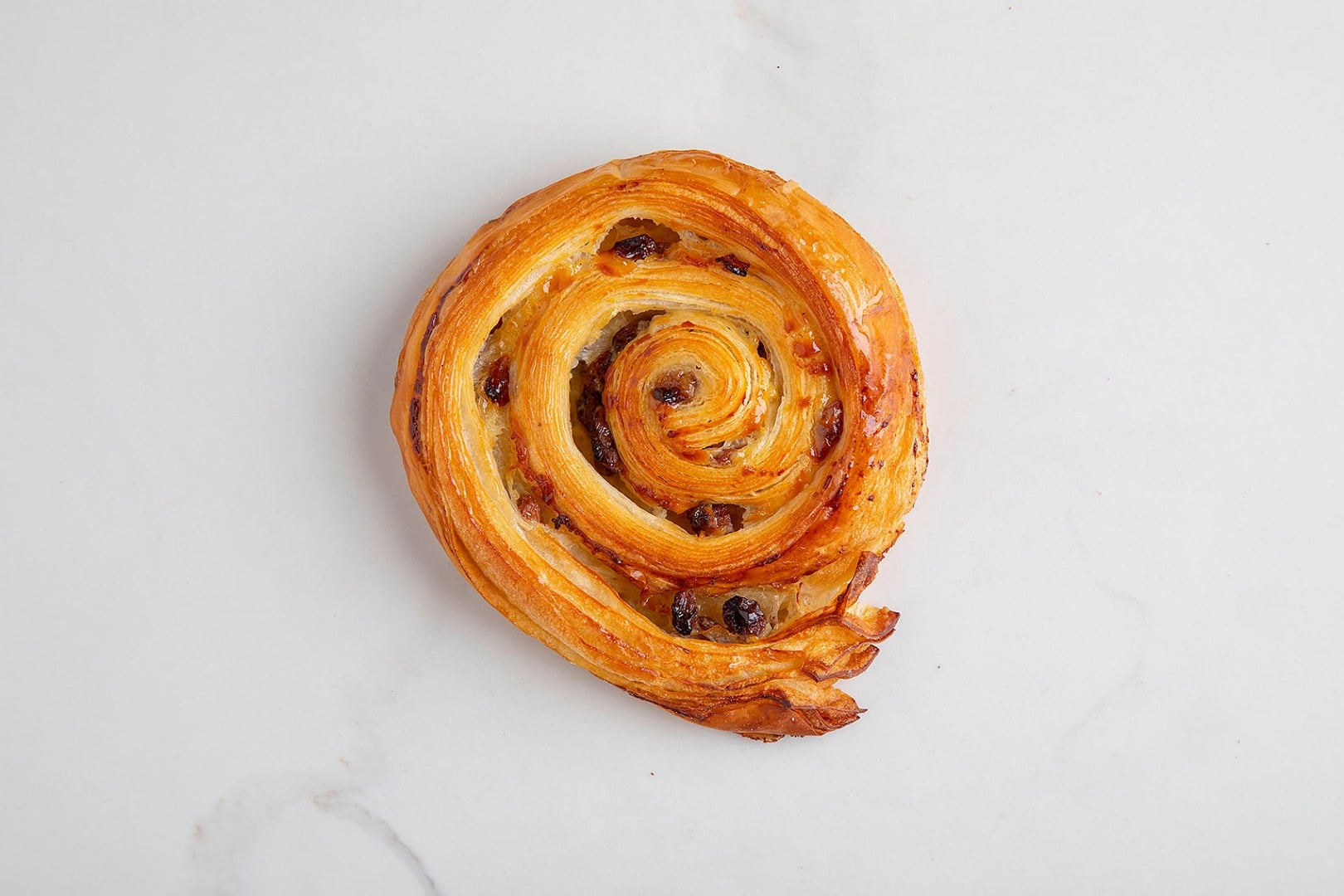 Mąka pszenna Label Rouge, płynny zakwas pszenny, masło gostyńskie, krem pâtissière, rodzynki sułtańskie i miechunka suszona, marynowana w rumie.